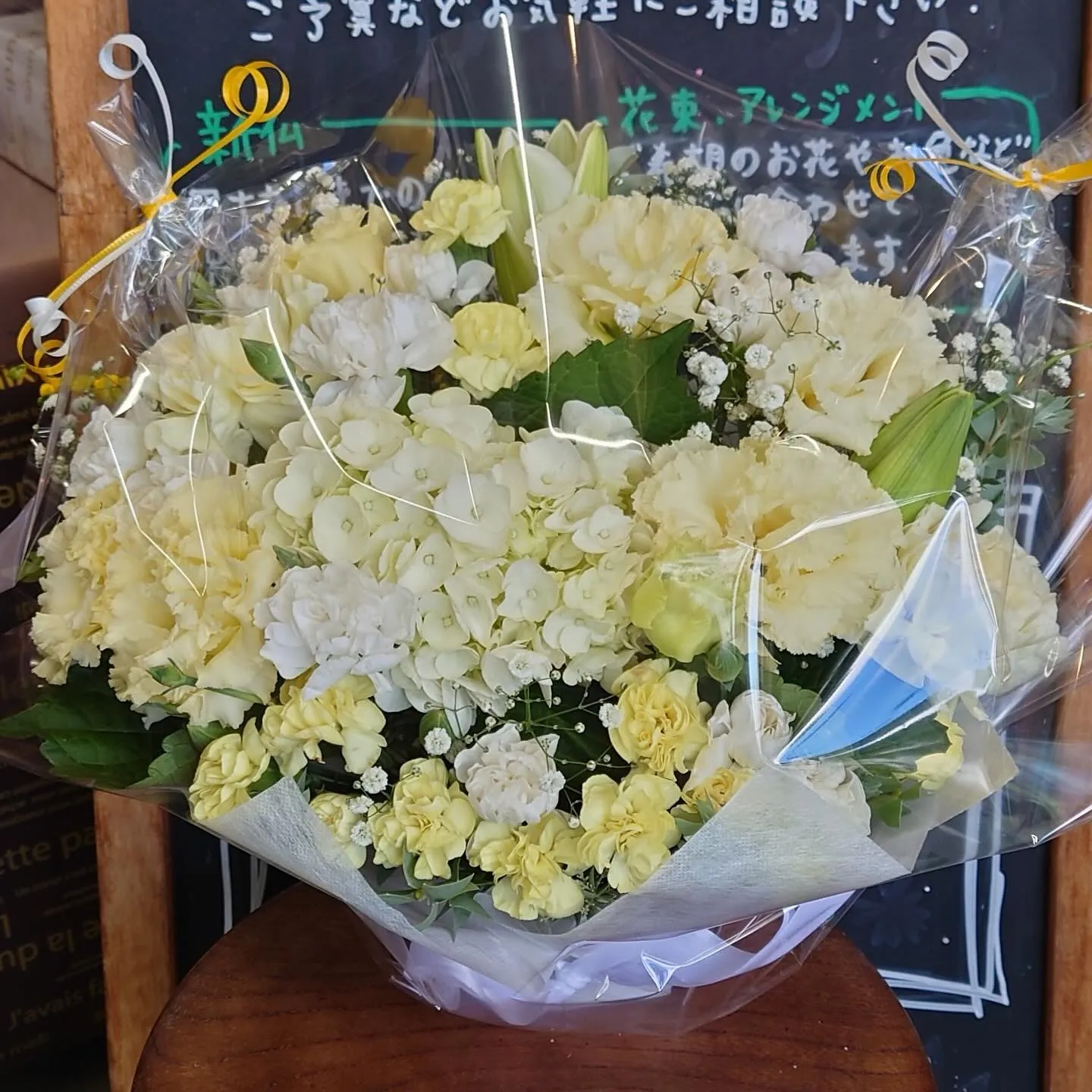 お供えのアレンジメント 2025/10/18 お供えのアレンジメント 白と黄色のお花で作ったのですが、パッと見の印象がクリーム色に見えるという不思議な仕上がりになりました😊 #フラワーアレンジメント #お供え花アレンジ #フラワーギフト #花のある暮らし #花屋 #藤井寺市