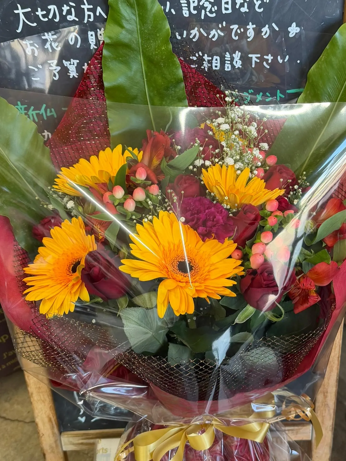 周年祝いの花束💐 2025/11/10 周年祝いの花束💐 お店へのお届けなので大きめの葉物(タニワタリ)を使い存在感のあるボリュームにしました ガーベラも大輪のものを使用すると周りのバラに負けないくらいの存在感が出ますね😊 #タニワタリ #花束 #花のある暮らし #花屋 #藤井寺市 #フラワーギフト