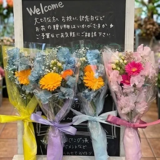 お花1本からでもリボンを付けたりしてプレゼント用に出来るので、お小遣いで買いに来られる小さなお客様もいらっしゃいます